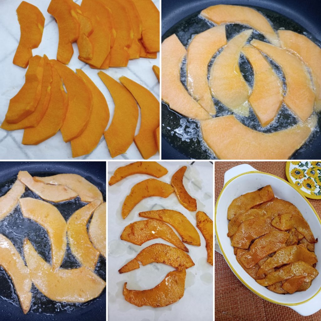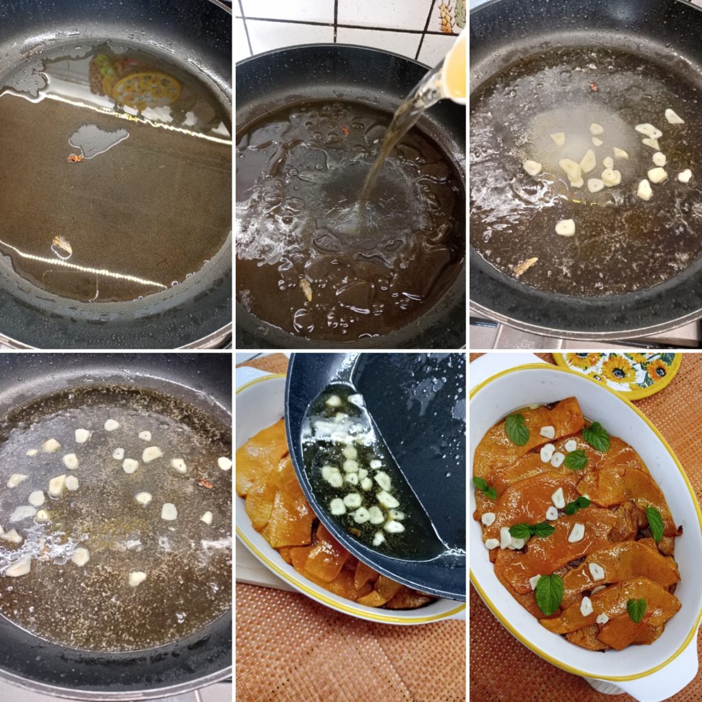 La courge frite, douce et tendre, est marinée dans une sauce intense. L’équilibre parfait est donné par le vinaigre et le sucre (pour une délicate caramélisation), enrichi d’une touche d’ail et de la fraîcheur piquante de la menthe (ou petite menthe).
