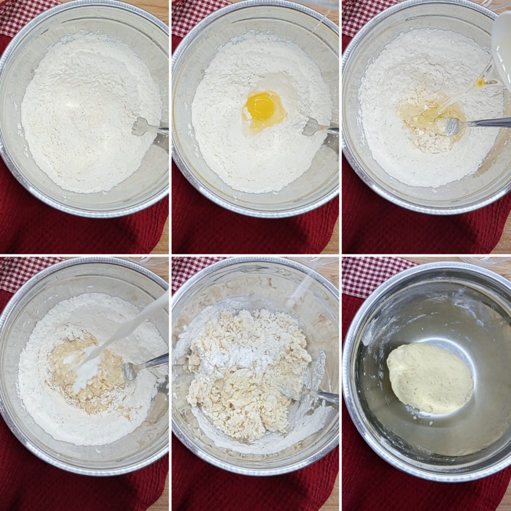 Verser la farine et le sucre dans un bol et mélanger. Commencer à ajouter le lait tiède puis l’huile, incorporer également l’œuf et pour finir la levure. Pétrir autant que possible dans le bol puis continuer à travailler la pâte sur une surface farinée jusqu’à obtenir une boule, pour compacter la boule il pourra être nécessaire d’ajouter de la farine.