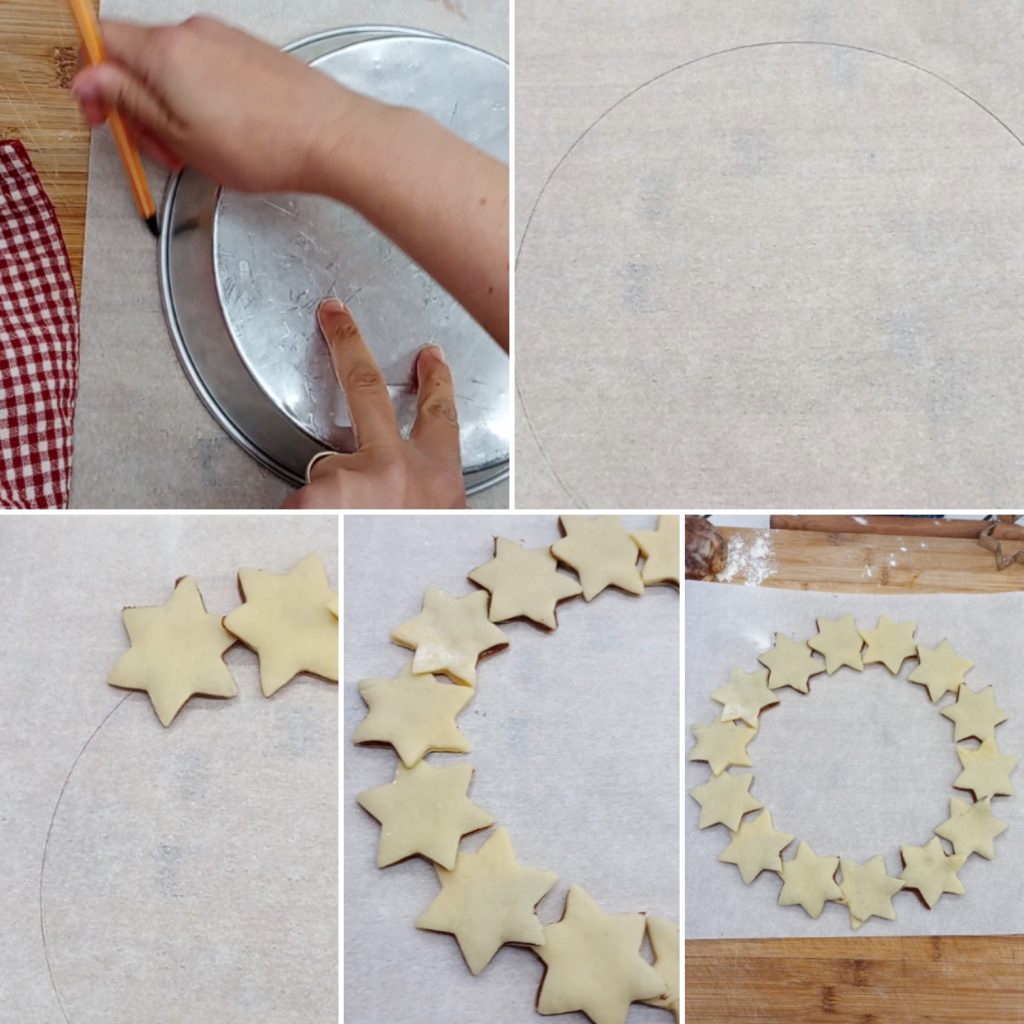 avec l’aide d’une assiette de 24 cm de diamètre créer un cercle sur le papier sulfurisé, disposer autour du cercle les étoiles en les superposant, bien presser les pointes pour les faire coller entre elles. Une fois la couronne créée, enfourner à 180 degrés four statique préchauffé pendant 15 minutes