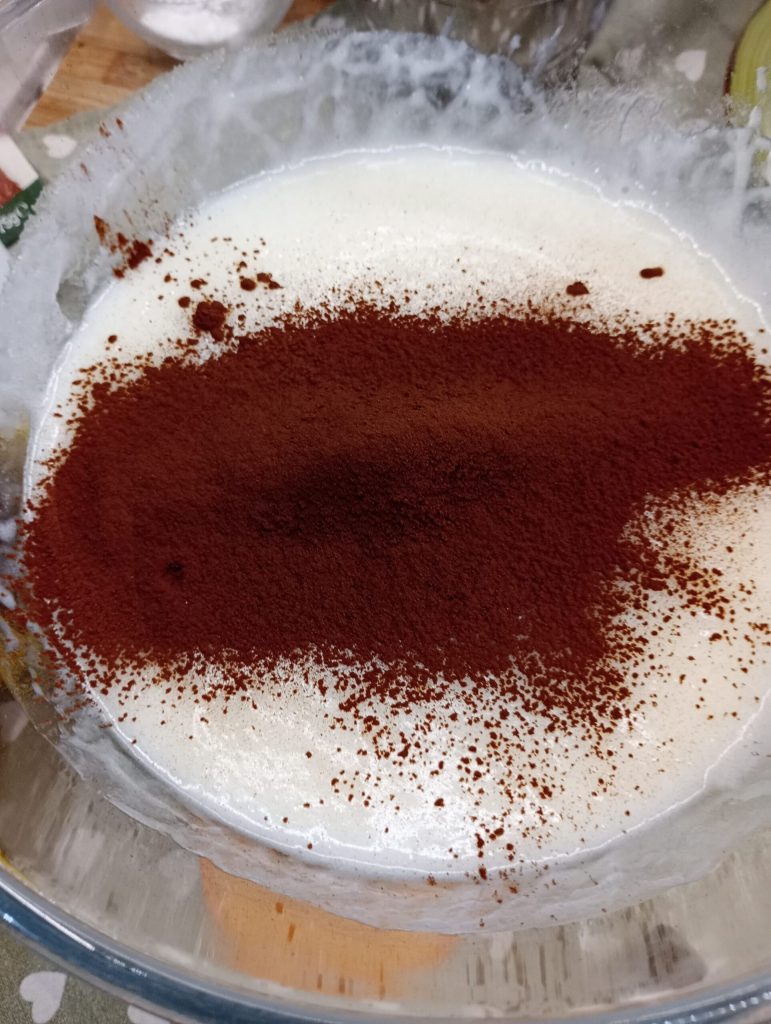 Quand la crème est presque dense retirer du feu et ajouter le cacao amer tamisé et mélanger énergiquement avec un fouet pour éviter la formation de grumeaux