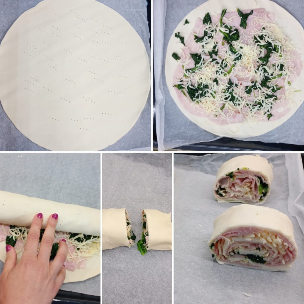 Répartissez uniformément la mozzarella coupée en morceaux. Si vous utilisez aussi les épinards comme je l’ai fait (environ 250 g), dispersez-les sur la mozzarella. Attention: ne pas exagérer avec la garniture, sinon elle pourrait s’échapper pendant la cuisson.Roulez la pâte sur le côté long, en serrant bien, pour créer un rouleau compact.