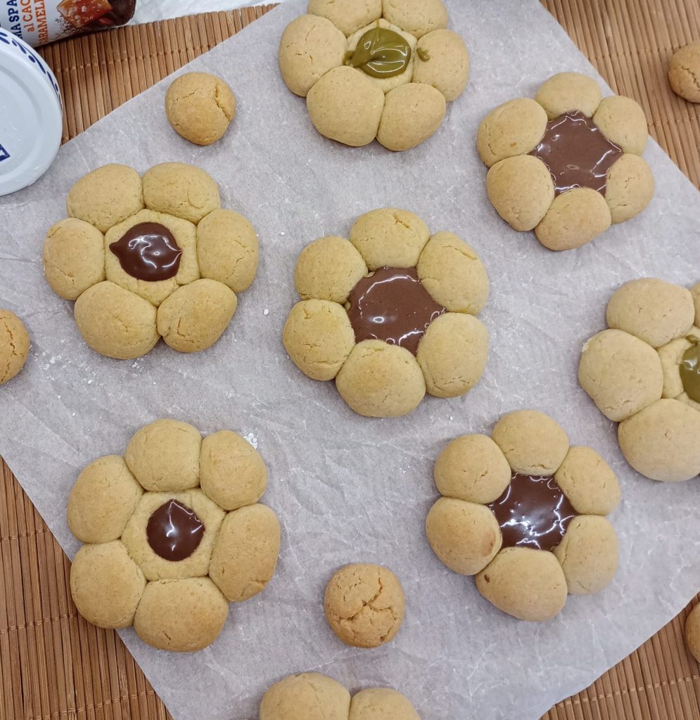 Les fleurs de biscuit sont de délicieux petits gâteaux, très faciles à réaliser et très jolis à présenter. J’ai décidé de rendre ces fleurs encore plus gourmandes en plaçant au centre des crèmes à tartiner mais vous pouvez également utiliser des confitures ou des marmelades. Venez avec moi, on commence tout de suite à s’amuser.
