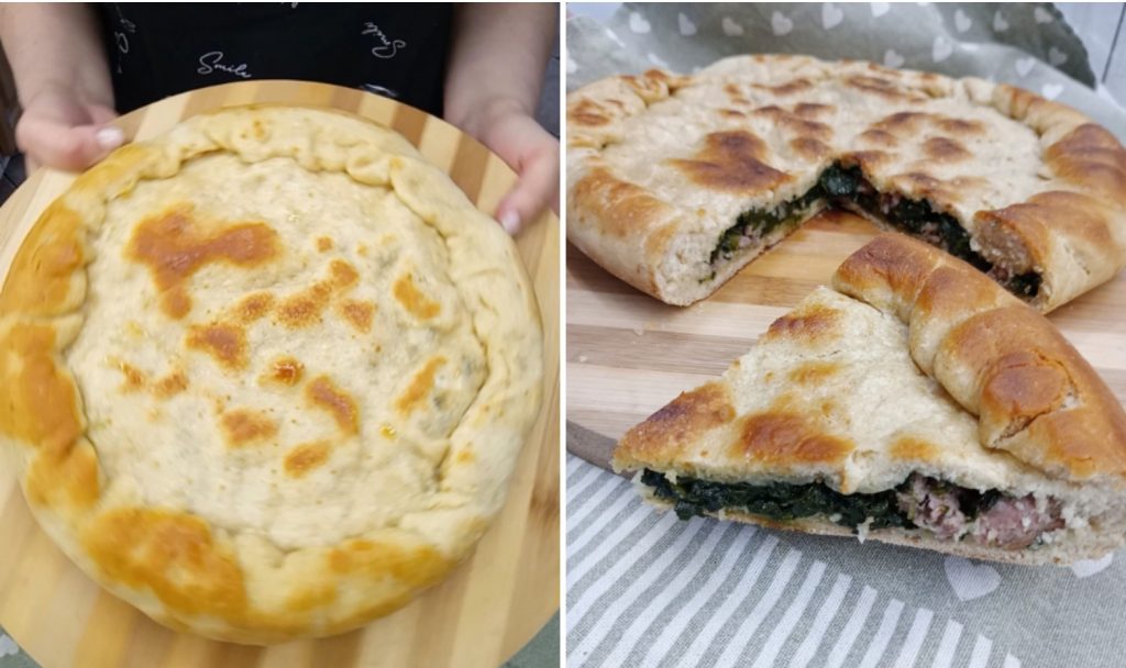 Verser à l’intérieur de la base de pâte les épinards (bien essorés !) et la saucisse (déjà cuite, si vous le préférez, ou crue pour les plus audacieux !). Répartissez la garniture de manière uniforme.