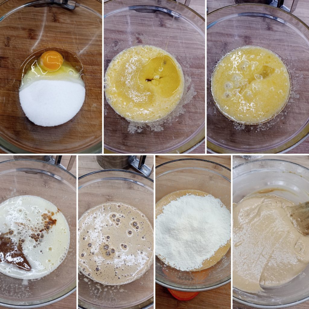 Avec un fouet à main, mélanger le sucre avec l’œuf, ajouter l’eau, l’huile, le café et bien mélanger.