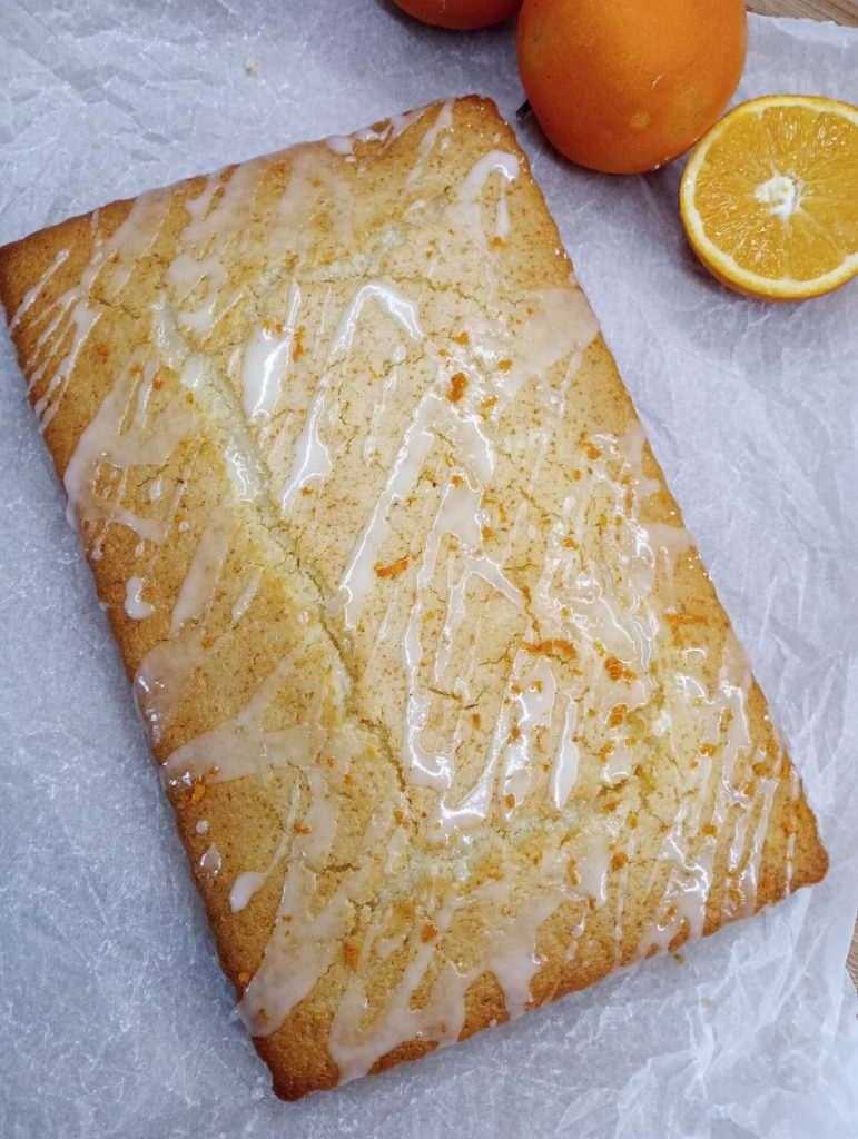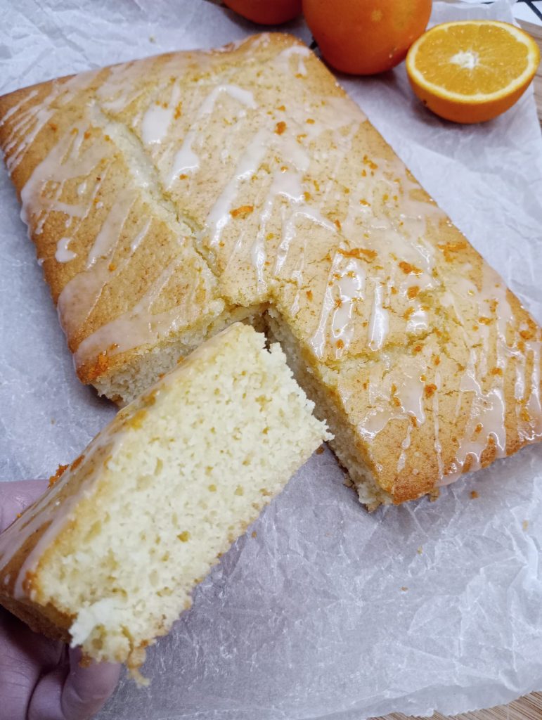 Pour compléter le gâteau, j’ai réalisé un glaçage très simple en mélangeant 50 grammes de sucre glace avec 2 cuillères à soupe de jus d’orange frais. J’ai bien mélangé jusqu’à obtenir une crème lisse.