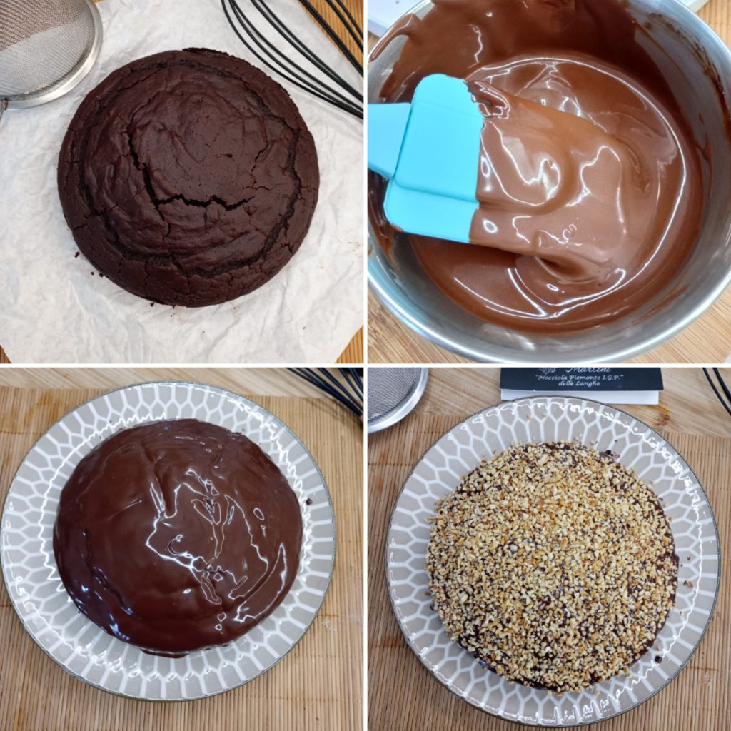 Verser la crème obtenue sur le gâteau jusqu’à le couvrir, disposer les noisettes concassées par-dessus.