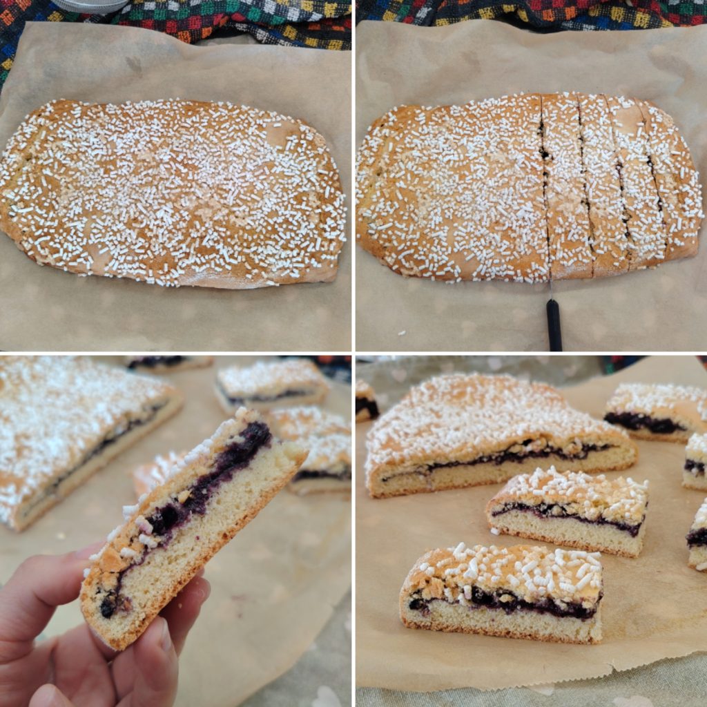 • Divisez la pâte en deux parts. À l’aide d’un rouleau à pâtisserie, étalez la première boule sur une feuille de papier cuisson en essayant de donner une forme rectangulaire d’environ 30×15 cm. Garnissez avec la confiture de myrtilles, en laissant une petite marge sur les bords. Étalez la deuxième boule, toujours avec le rouleau, et posez-la sur la confiture pour refermer la pâtisserie. Scellez bien les bords avec les doigts ou les dents d’une fourchette.