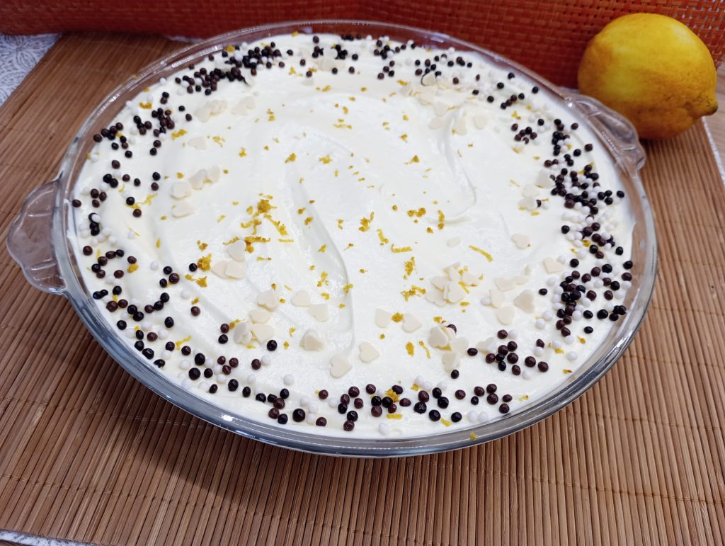 J’ai saupoudré la surface avec du zeste de citron râpé et des perles de chocolat blanc et noir