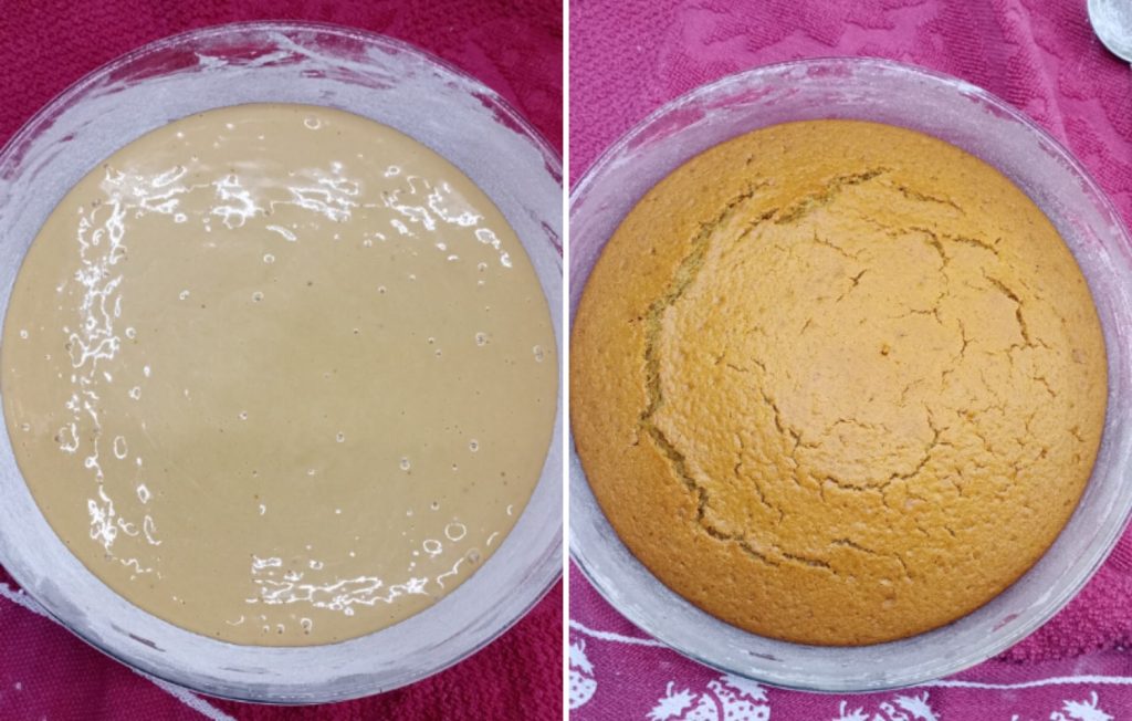 Versez ensuite le lait, l’huile et l’eau, en continuant de mélanger avec un fouet à main. Enfin, ajoutez la farine, la levure et la vanilline, en prenant soin de les tamiser auparavant pour éviter les grumeaux.Mélangez le tout rapidement avec le fouet jusqu’à obtenir une pâte lisse et versez-la dans un moule de 20-22 cm préalablement beurré et fariné.