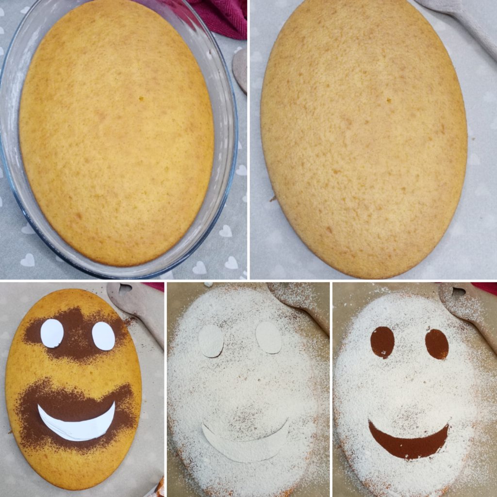 Une fois prêt, laissez le gâteau refroidir complètement dans le moule avant de le démouler. Pour la décoration, dessinez sur une feuille deux yeux et une bouche, découpez-les et posez-les sur la surface du gâteau. Saupoudrez abondamment de sucre glace puis retirez délicatement les gabarits en papier.