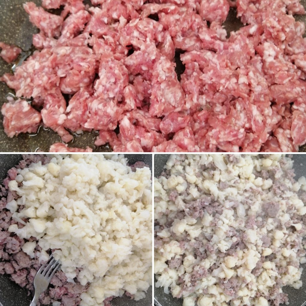 Dans une poêle avec un filet d’huile, faire revenir la saucisse. Ajouter le chou-fleur précédemment égoutté et faire cuire pendant quelques minutes. Laisser tiédir.
