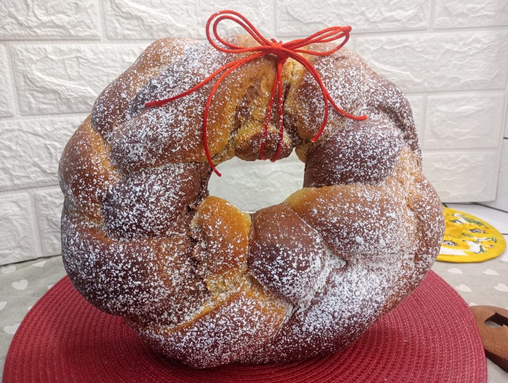 Enfin, j’ai joint les extrémités de la tresse pour en faire une couronne (ou un anneau).Au centre de ta couronne (ou anneau) de pain brioche, dépose un petit bol que tu auras préalablement bien huilé. Cela sert à maintenir la circonférence nécessaire et empêcher que la pâte ne se referme trop pendant la levée.