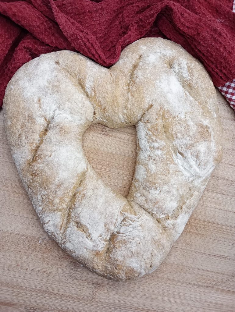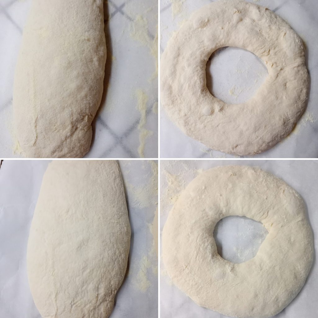 Comme vous pouvez le voir sur les photos, vous pouvez réaliser deux pains ou un pain et une couronne, ou encore donner la forme d’un cœur simplement en créant un trou au centre et en façonnant.