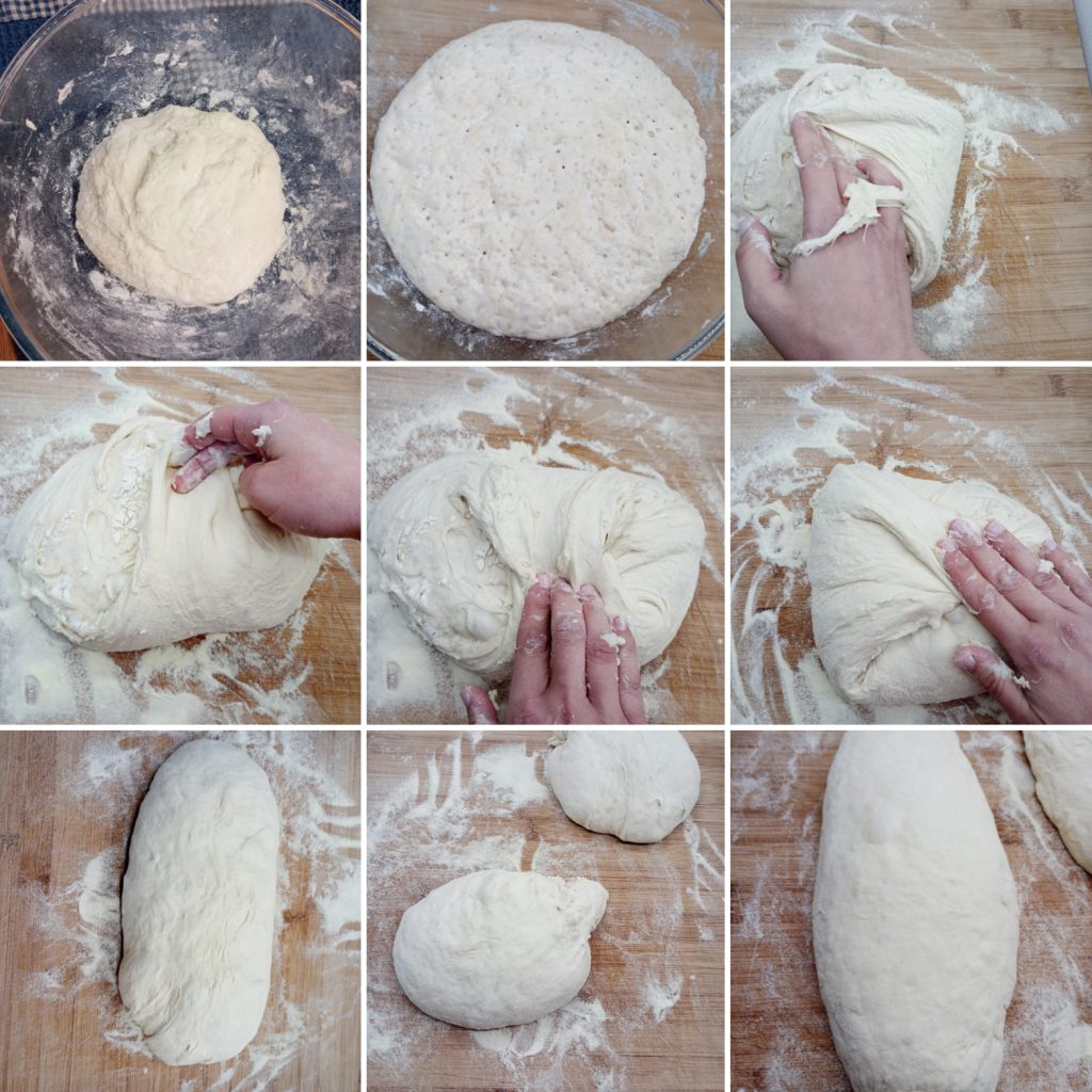 Après ce temps, retourner sur une surface abondamment farinée et réaliser les plis en partant de l’extérieur vers l’intérieur de tous les quatre côtés. Former un pain et le diviser en deux parties.