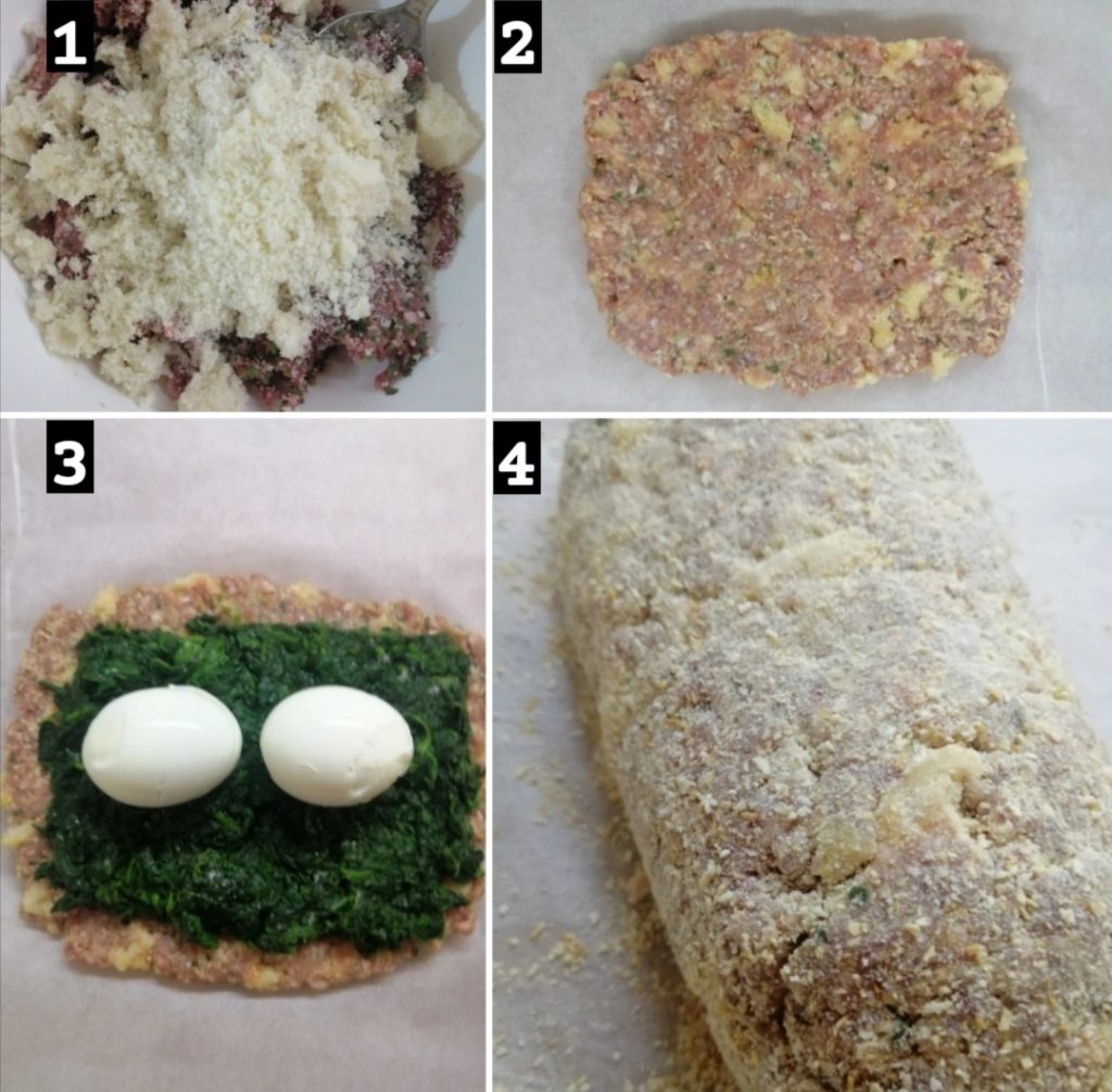 Dans un bol, insérez tous les ingrédients et mélangez bien. Une fois le mélange prêt, étalez-le sur une feuille de papier sulfurisé, essayez de lui donner une forme rectangulaire. Prenez les épinards blanchis et salés au préalable et disposez-les sur la base de viande. Placez les œufs durs au centre.