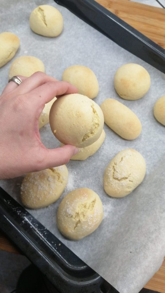 Transférer la pâte sur un plan de travail fariné, travailler jusqu’à obtenir une boule. Commencer à former des petites boules ou d’autres formes et les disposer sur une plaque recouverte de papier cuisson.