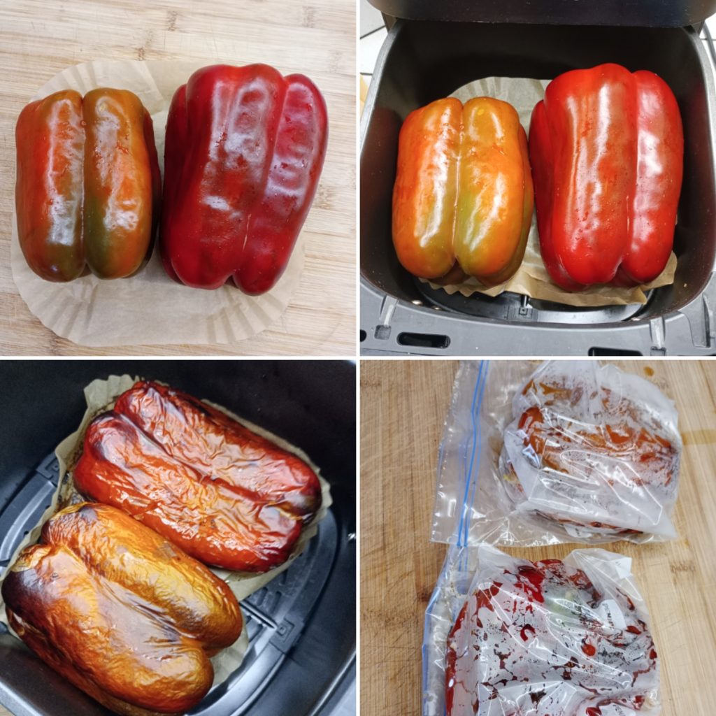 Éplucher les poivrons n’a jamais été aussi simple. Il suffira de les cuire 20 minutes dans une friteuse à air, de les envelopper dans des sacs en plastique pour aliments et vous verrez qu’ils s’éplucheront presque tout seuls.