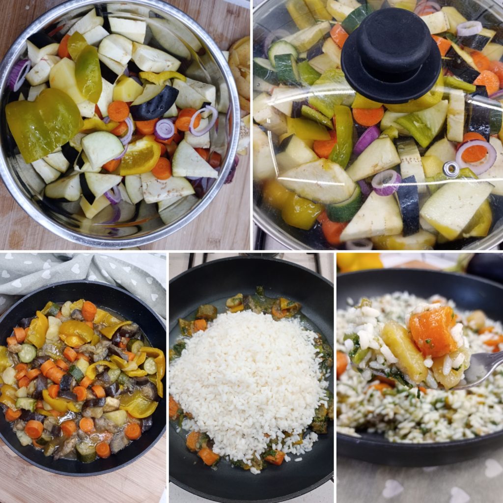 Entre-temps, mettez une casserole sur le feu et faites cuire le riz dans une abondante quantité d’eau salée en suivant les instructions sur l’emballage. Une fois cuit, égouttez-le bien et ajoutez-le directement dans la poêle avec les légumes cuits, qui seront désormais savoureux et parfumés.