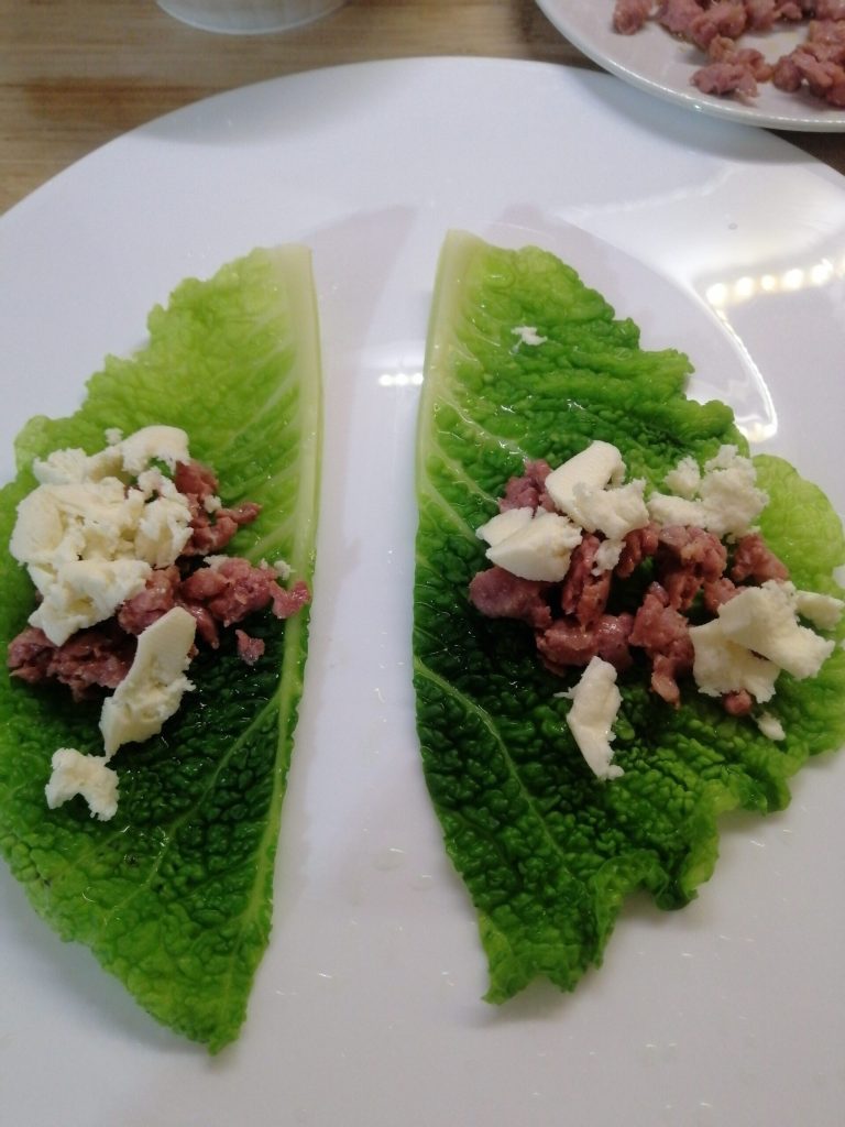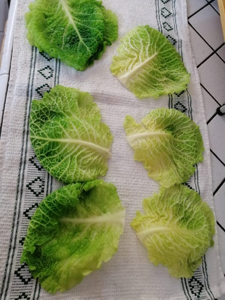Dans une casserole avec de l’eau bouillante salée, blanchir pendant 2 minutes les feuilles de chou, une fois 2 minutes écoulées, mettre les feuilles de chou sur un torchon propre