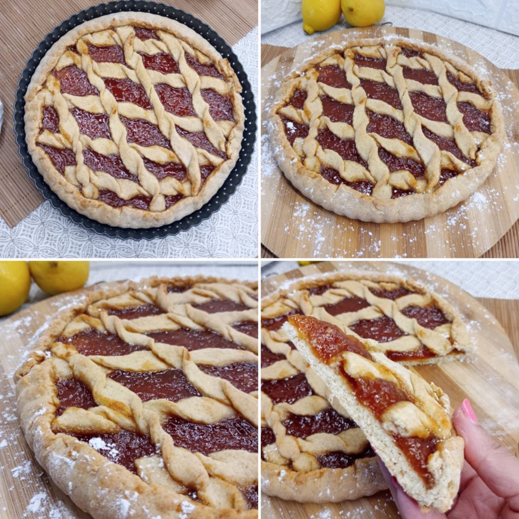 Déposer et niveler à l’intérieur la confiture, et avec la pâte restante, créer des bandes. J’ai torsadé les bandes, je les ai aplaties légèrement, puis je les ai placées sur le dessus. Abaisser les bords de la tarte vers l’intérieur.