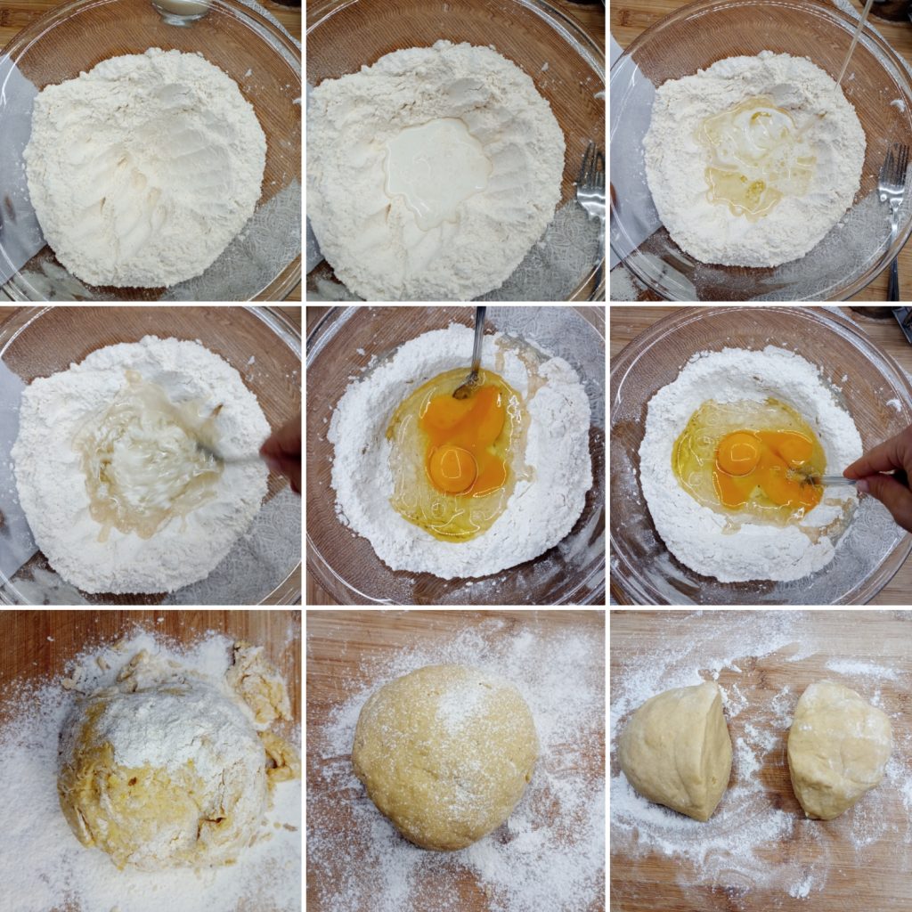 Commencer à ajouter le lait tiède puis l’huile; ajouter également l’œuf et le zeste râpé du citron. Pétrir tant que possible dans le bol puis continuer à travailler la pâte sur un plan fariné jusqu’à créer un pain. Pour compacter la pâte, il pourrait être nécessaire d’ajouter plus de farine.Étaler le pain et le déposer à l’intérieur d’un moule beurré et fariné. (J’ai utilisé un moule rectangulaire, mais si tu préfères, tu peux utiliser un moule rond de 22-24 centimètres de diamètre.)