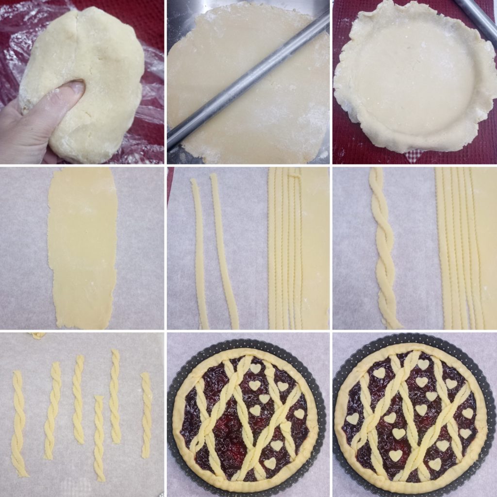 Avec la pâte sablée restante, créez des bandes et disposez-les sur la confiture pour former un motif en treillis.Enfournez dans un four statique préchauffé à 180°C pendant 35-40 minutes.