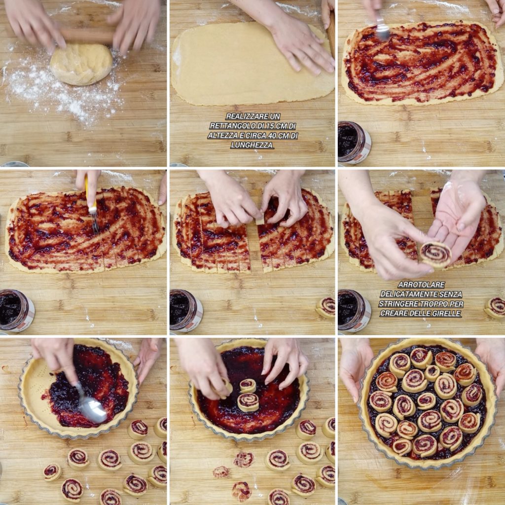 Prendre l’extrémité de chaque bande et commencez à enrouler sur elle-même pour former votre roulé (la rose).Une fois tous les roulés créés, reprenez le moule avec la base sablée et étalez la confiture restante.