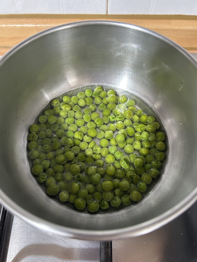 Dans une petite casserole, insérez les petits pois surgelés. (Si vous préférez, vous pouvez utiliser des petits pois frais ou en conserve). Couvrez-les d’eau. Ajoutez également une cuillère à café d’huile d’olive extra vierge.