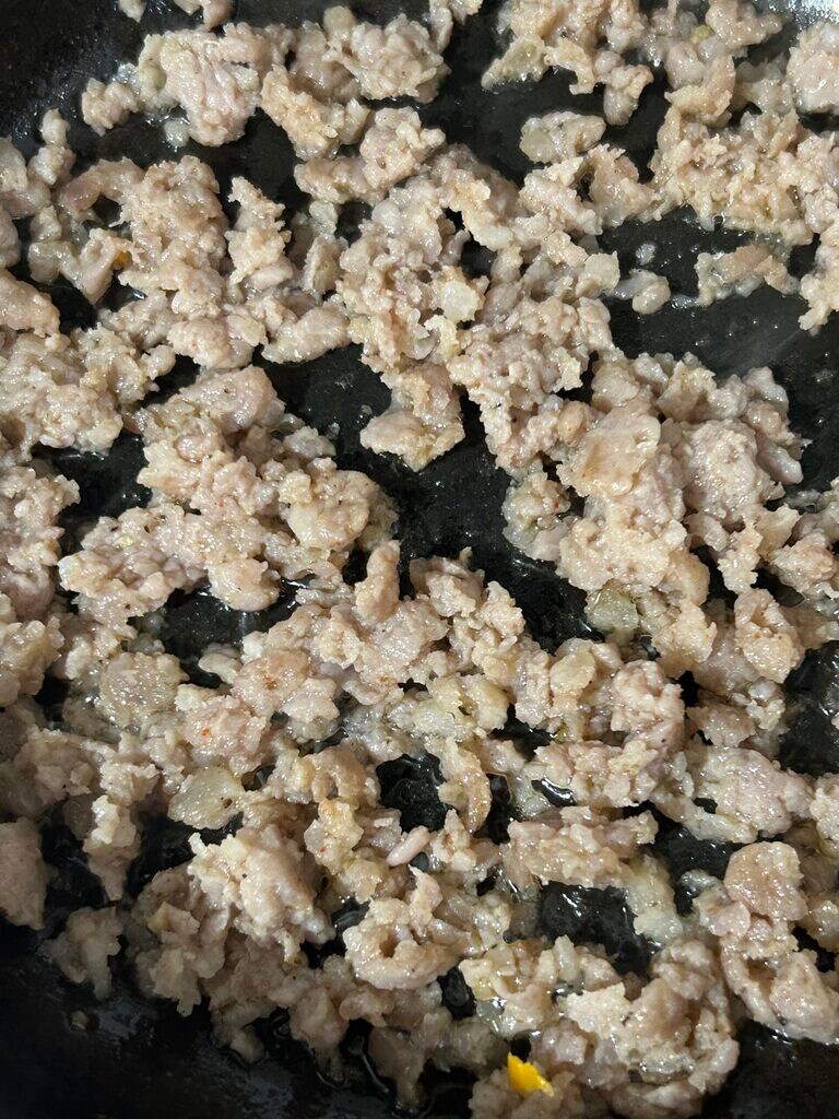 Pendant ce temps, dans une poêle antiadhésive, insérez une saucisse émiettée après avoir retiré le boyau. Laissez dorer quelques instants.