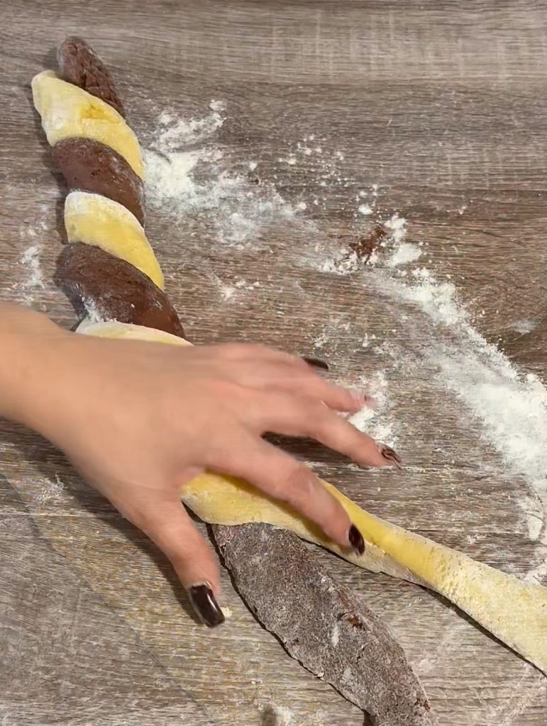 • Divisez la pâte en deux parts égales, et dans l’une des parts, ajoutez le cacao amer en poudre. Pétrissez pour incorporer le cacao à la pâte.