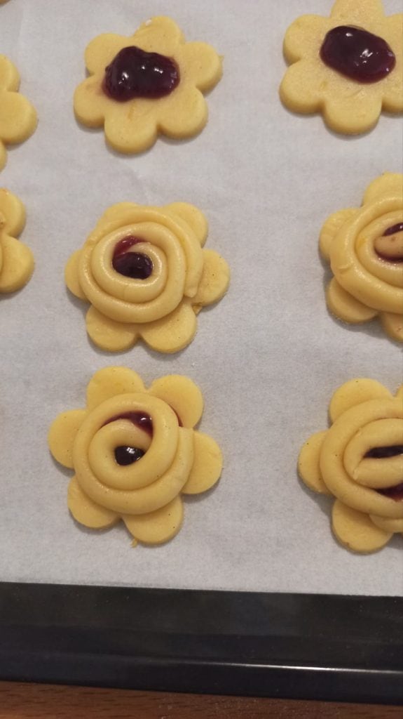 Enfournez dans un four chaud, statique à 180 degrés et laissez cuire environ 12/15 minutes. Vérifiez bien les temps de cuisson en fonction de votre four. Les biscuits doivent rester clairs et ne pas trop foncer.