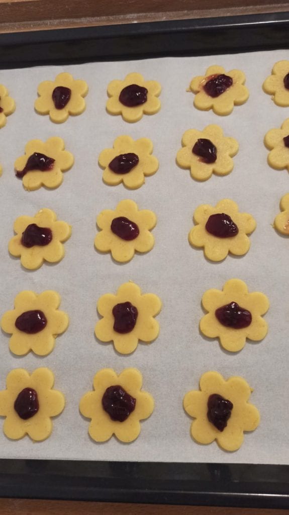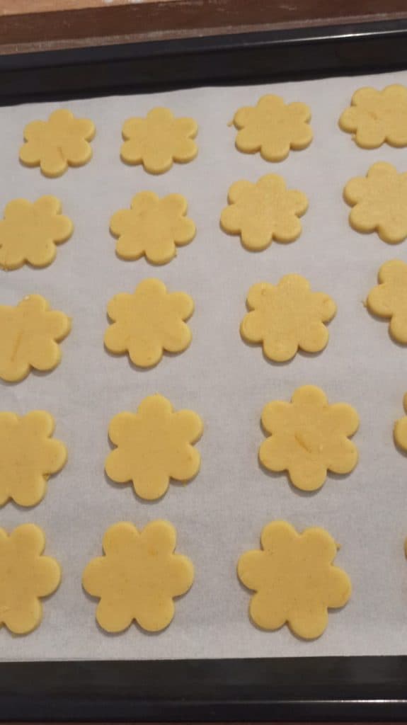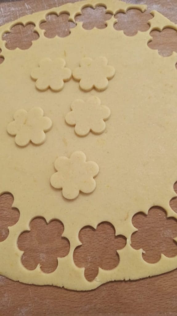 Après une demi-heure, reprenez la pâte et étalez-la (à une épaisseur d’un demi-centimètre) avec le rouleau à pâtisserie sur un plan légèrement fariné. Avec un emporte-pièce en forme de fleur, réalisez les biscuits.