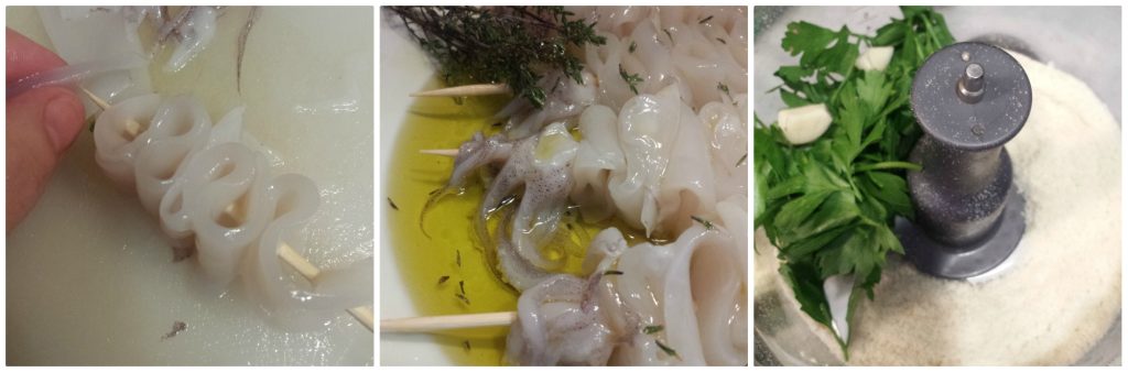 Au fur et à mesure que vous préparez les brochettes, placez-les dans la marinade préparée avec de l’huile, du jus de citron, du thym et du sel et, très important, les tourner de temps en temps. Pendant qu’ils s’imprègnent, préparez la panure en mettant dans le hachoir la mie de pain, le parmesan, le persil, l’ail, le sel et broyer.