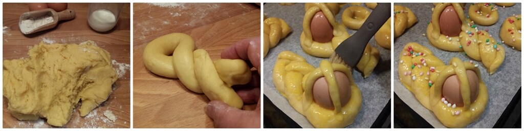 Verser la pâte sur le plan de travail fariné et façonner la masse. Couper des morceaux de 120 g et donner la forme. Si vous voulez une tresse, faire un boudin, tresser et poser dans le trou l’œuf bien lavé et séché. Avec un peu de pâte sablée, fixer l’œuf. Dans un petit bol, mélanger un jaune d’œuf avec une goutte de lait et badigeonner les Cuzzupe. Saupoudrer de paillettes colorées et enfourner. Cuire pendant 25-30 minutes. Éteindre le four et laisser reposer avec la porte ouverte pendant 5 minutes. Une fois refroidies, décorez la table pascale avec les Cuzzupe calabraises moelleuses.