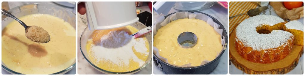 Préchauffez le four statique à 175 degrés. Versez les œufs et le sucre dans un bol et fouettez avec les fouets électriques jusqu’à obtenir une masse mousseuse. Ajoutez l’huile et les kakis lavés, pelés et mixés. Incorporez-les en utilisant toujours les fouets électriques à basse vitesse.