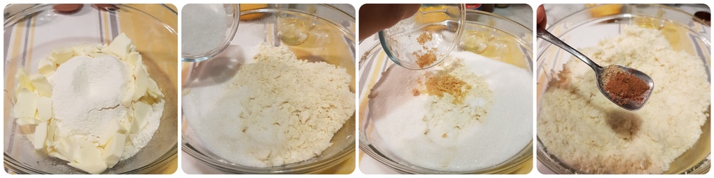 Verser dans un bol la farine tamisée et le beurre mou en morceaux. Les travailler avec les mains jusqu’à les sabler puis ajouter le sucre, la vanilline, le zeste râpé du citron, le sel et les épices en poudre.