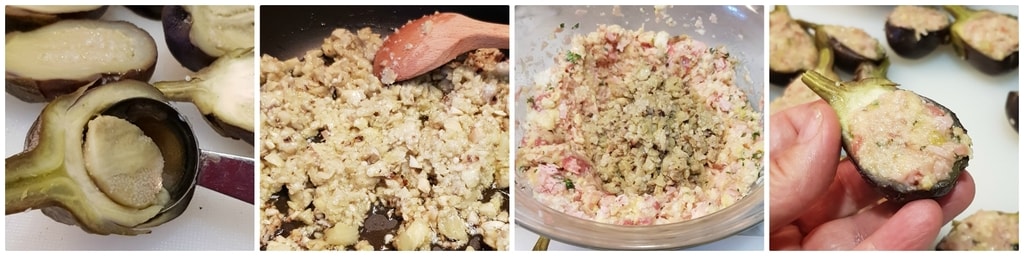 Avec une cuiller à melon, retirer une partie de la chair qui sera hachée avec l’ail et les champignons trempés. Verser 3 cuillères à soupe d’huile d’olive extra vierge dans une poêle et faire revenir le tout pendant quelques minutes. Ajouter aux autres ingrédients, mélanger et laisser reposer 10 minutes. Après le repos, prélever un peu de farce avec une cuillère à café et farcir les petites aubergines.