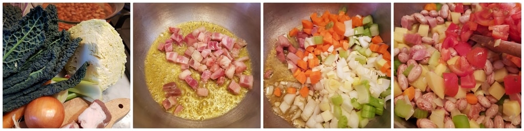 Garder l’eau sur le feu qui sera utilisée à la fin. Préparer une brunoise avec le céleri, la carotte, l’oignon, et les pommes de terre. Verser l’huile au fond de la casserole avec le lard coupé en dés, faire légèrement revenir et ajouter les dés de légumes, le poireau émincé et l’ail haché. Mélanger pour donner du goût, ajouter les haricots égouttés de leur trempage et rincés et les tomates en morceaux.