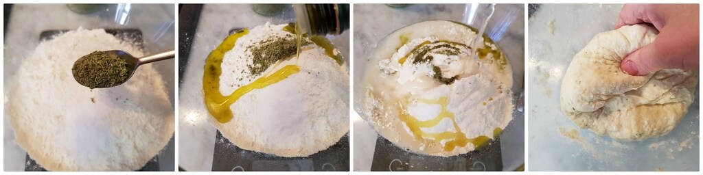 Dans un grand bol, verser la farine tamisée, ajouter les herbes, le sel, l’huile d’olive extra vierge et enfin l’eau légèrement tiède. Mélanger les ingrédients et pétrir longuement jusqu’à former une boule qui sera enveloppée dans un film plastique et laissée à reposer 20 minutes.