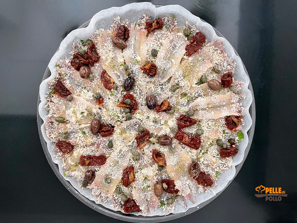Panez les anchois avec le hachis aromatique, des deux côtés, puis disposez-les dans le plat. Arrosez-les d’un filet d’huile, puis ajoutez les tomates séchées coupées en morceaux, les olives et les câpres (après les avoir rincées pour enlever le sel ou le vinaigre).