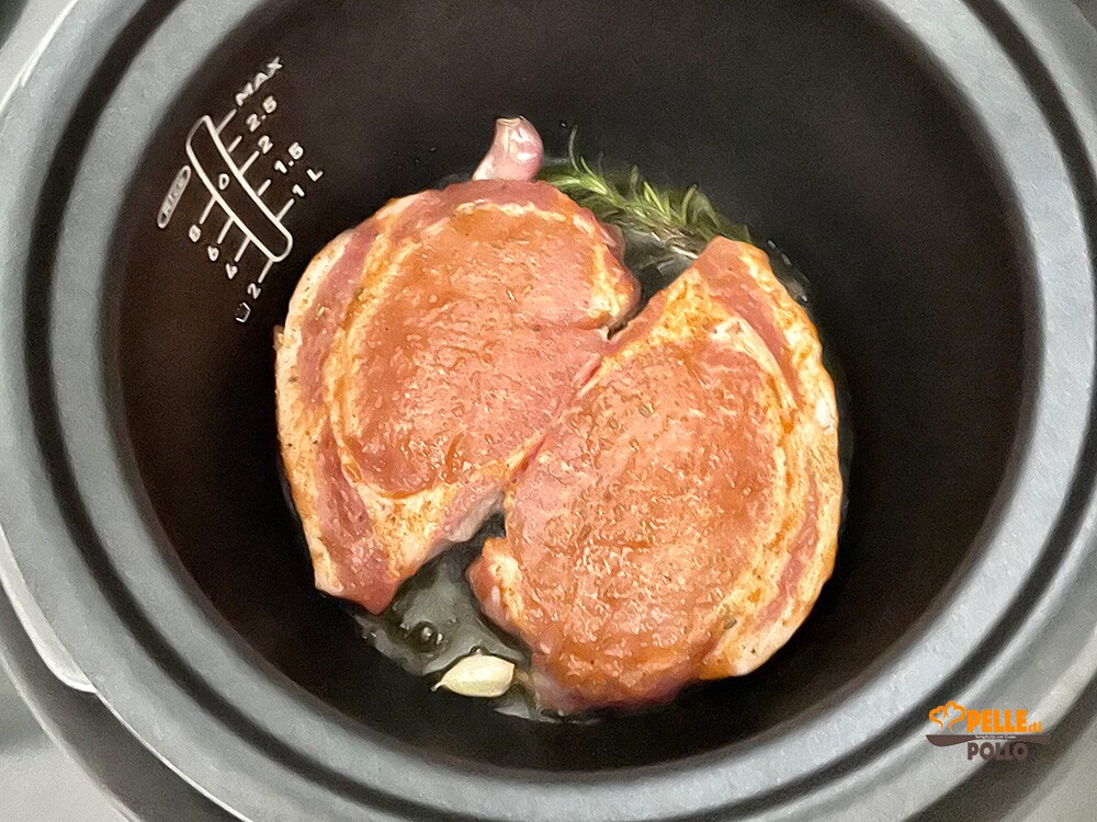 Mettez dans la casserole du multicooker une gousse d’ail, un brin de romarin et un filet d’huile. Faites revenir quelques secondes, puis disposez les côtelettes et saisissez-les pendant une ou deux minutes.