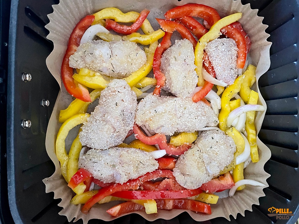 Placez dans le panier de la friteuse le papier cuisson approprié, et disposez-y le poisson, les poivrons et l’oignon, en essayant de ne pas les superposer.