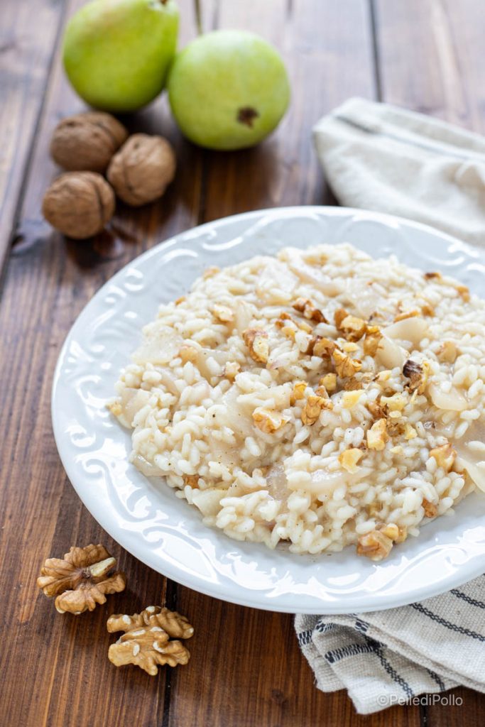 Risotto aux poires et noix, un plat principal très simple, qui vous fera bonne impression en famille, en quelques minutes seulement. Juste le temps de cuisson du riz, et vous apporterez à table un plat délicat et savoureux, parfait pour la saison automnale. Moi, je n’aime pas les fromages, donc je n’ai pas ajouté les classiques gorgonzola ou taleggio… si vous les aimez, il vous suffira de les ajouter à la fin de la cuisson, à la place du beurre. Essayez cette recette, elle est très facile mais très savoureuse!