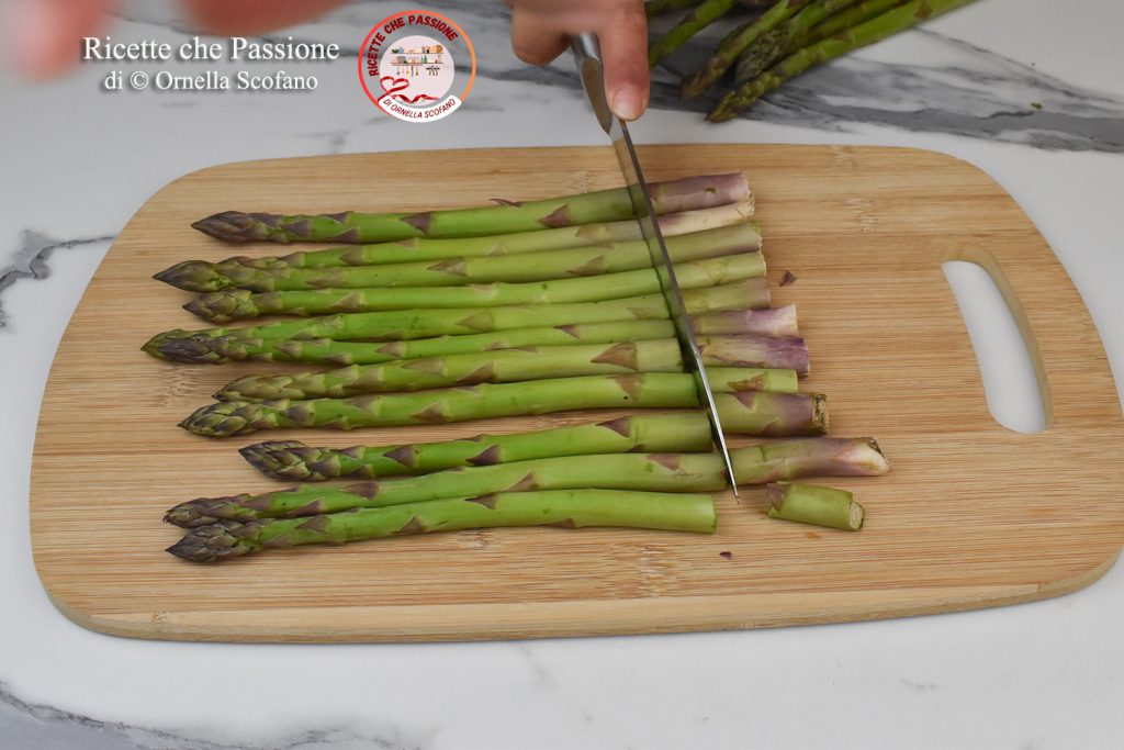 Nous commençons par nettoyer les asperges, il suffit de retirer la partie dure à la base, nous coupons avec le couteau une petite portion, si la partie enlevée est tendre, nous pouvons raccourcir moins, ou si à la coupe, elle est dure, nous raccourcissons plus.
