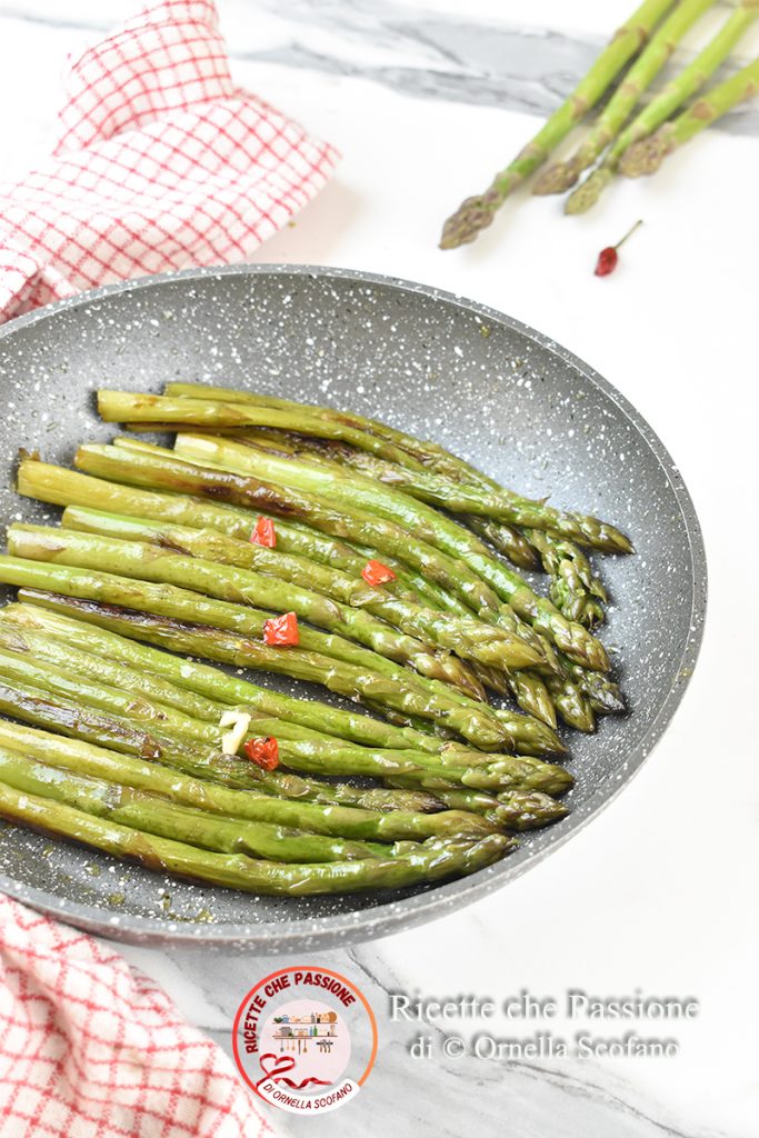 Asperges à la poêle, accompagnement printanier avec des asperges fraîches de saison, savoureuses et tendres. Il ne faudra que quelques minutes pour préparer un excellent accompagnement avec des asperges fraîches, rapidement cuites à la poêle avec de l’ail et du piment. Les asperges, qu’elles soient cultivées ou sauvages, sont riches en potassium, calcium et magnésium, sans oublier leur apport en vitamine C et en fer, elles sont faibles en calories et sans cholestérol, donc consommons-les en quantité car elles sont bénéfiques, et les fibres qui les composent aident à maintenir notre intestin en bonne santé. J’adore aller cueillir celles qui sont sauvages quand je suis chez ma mère, de mars à mai, on peut récolter les jeunes pousses qui poussent à côté des plantes plus anciennes, mais quand je n’ai pas la possibilité d’aller les cueillir, j’achète celles qui sont cultivées, tout aussi bonnes. Voyons comment les cuisiner rapidement à la poêle pour un excellent accompagnement, ou comme base pour une délicieuse omelette aux asperges. Essayez aussi le risotto aux asperges.