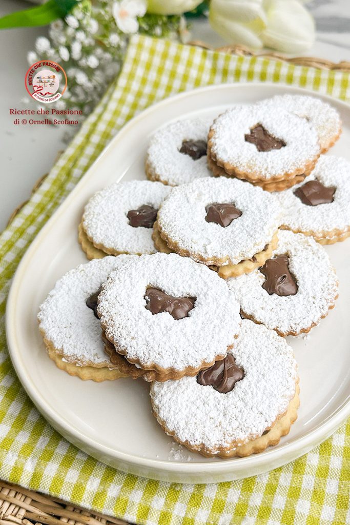 Biscuits au Nutella, les biscuits œil-de-bœuf de printemps, de délicieux biscuits croustillants réalisés avec une excellente pâte sablée au beurre en forme d’œil-de-bœuf, garnis de Nutella, ou, si vous préférez, d’une autre garniture, et décorés d’une petite fleur ou d’un papillon — un hymne joyeux au printemps qui, à son arrivée, nous donne envie d’être dehors, sur une pelouse fleurie, à regarder les papillons voltiger de fleur en fleur, tout en dégustant un ou deux biscuits faciles à emporter partout pour se faire plaisir avec cette petite douceur qui remonte toujours le moral. Voyons comment les préparer, ah, la recette est vraiment très facile et délicieuse.