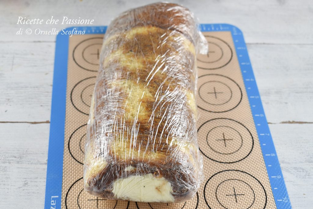 Mouillons avec le café toute la surface du pandoro. Garnissons de crème au mascarpone, en la répartissant sur toute la surface. Ensuite, roulons-le sur le côté le plus court.