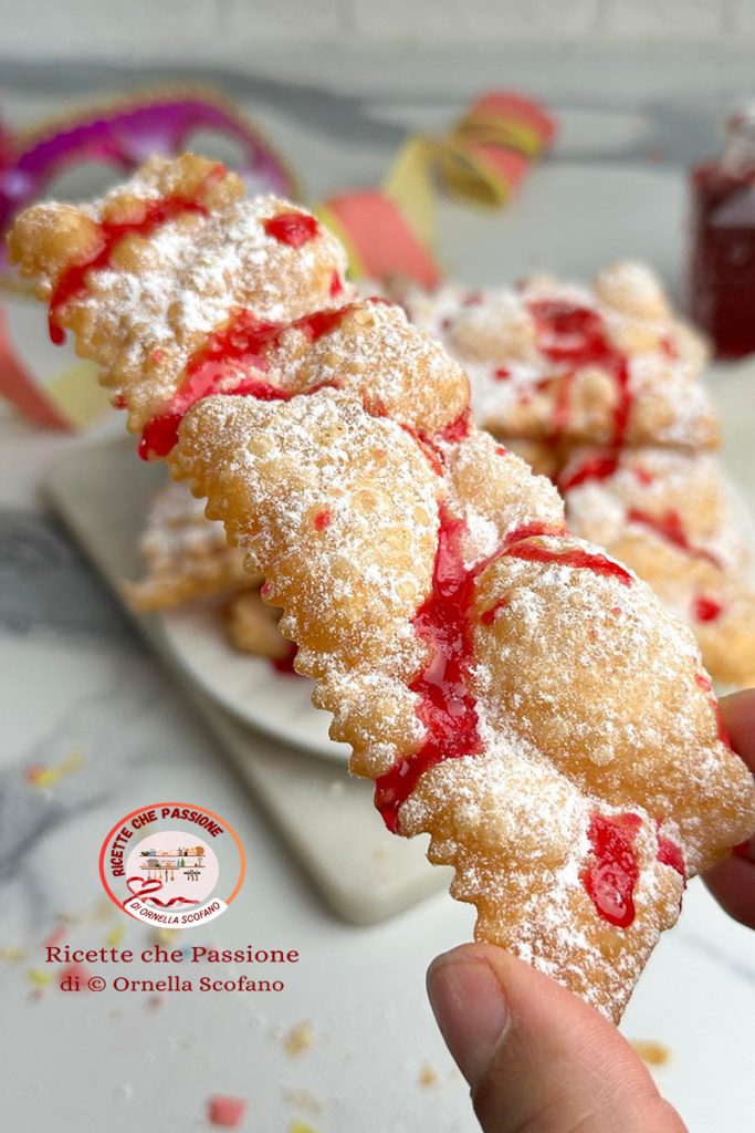 Bugnes de carnaval à l’alchermes, croustillantes et avec des bulles, encore plus gourmandes avec de l’alchermes dans la pâte. À Carnaval et dans la période qui le précède, l’envie de bugnes devient plus forte que d’habitude, alors on se met en cuisine pour préparer des quantités énormes de bugnes. Nous sommes encore en janvier mais je les ai déjà faites 2 fois, la première à la strega, et la deuxième avec de l’alchermes pour le bonheur de ma nièce, qui reçoit chaque fois quelques plateaux, tous prêts à être grignotés, et comme elle le dit, ils sont irrésistibles, un entraîne l’autre, donc c’est important d’en faire beaucoup, même énormément, tellement qu’en une semaine elle m’a presque forcée à les faire 2 fois. Je suis contente de lui faire plaisir, à condition de l’avoir toujours disponible pour éliminer ce que je cuisine, mais elle retournera bientôt à la faculté pour ses derniers examens avant la thèse.