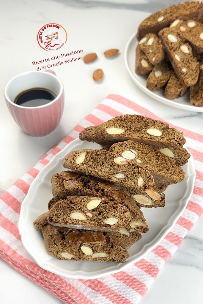 Cantucci au café avec amandes, les biscuits friables et croquants qui fondent dans la bouche, délicieux avec un bon arôme de café, j’ai utilisé du café soluble, mais on peut aussi utiliser un bon café espresso. Préparer les cantucci est vraiment très facile, après avoir perfectionné la recette classique des cantucci aux amandes, j’ai essayé de les faire aussi avec d’autres ingrédients. Il y a quelques semaines, je les avais préparés avec du chocolat noir, ils étaient tellement bons que cette fois, j’ai pensé les faire avec du café pour varier un peu. Je les adore parce qu’ils sont faciles à faire et se conservent longtemps bien fermés, croquants et secs grâce à la double cuisson, donc chaque fois que j’ai des invités ou que j’ai envie de quelque chose de gourmand, ils sont toujours dans le placard prêts à être rapidement grignotés ou servis.