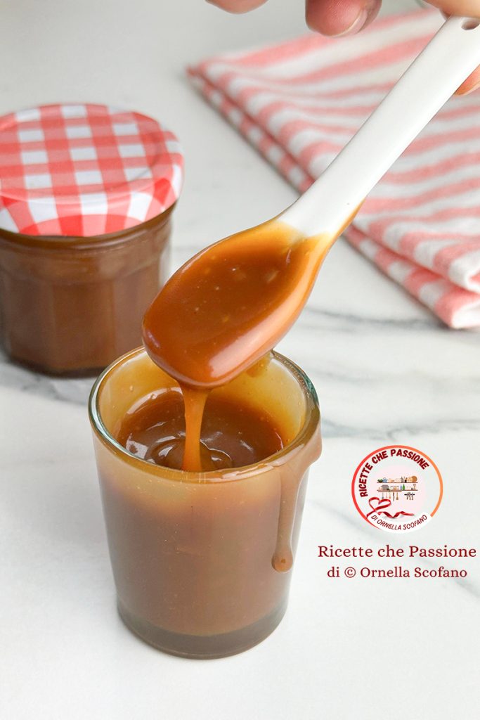 Caramel au beurre salé sans beurre ou si vous préférez avec peu de beurre, mais je vous conseille vivement de n’en utiliser que très peu, il n’est vraiment pas nécessaire d’utiliser beaucoup de beurre pour cette recette, la consistance est parfaite et en diminuant la quantité de crème, on peut le préparer plus ferme. La préparation du caramel au beurre salé est très simple et rapide à faire chez soi, pratiquement identique au caramel mou, dans ce cas le caramel, au moins pour moi, je le laisse légèrement plus clair pour avoir un délicieux goût de mou, ici par contre je prépare dans une petite casserole antiadhésive un caramel plus foncé, ainsi le goût du caramel est plus intense et on ne sent pas le goût typique des mou. Le caramel mou est sans sel et bien sûr si vous le souhaitez, vous pouvez également éviter le sel si vous voulez un caramel classique et non salé. Comme je vous l’ai déjà suggéré, vous pouvez varier la consistance en augmentant ou diminuant la dose de crème selon l’utilisation que nous souhaitons en faire. Je vous rappelle que le caramel durcit à froid, alors c’est à froid que vous comprendrez la véritable consistance, et vous adapterez petit à petit. Si vous le préparez plus ferme, avec moins de crème, il sera plus facile de le rendre plus souple, en chauffant le caramel et en lui ajoutant une autre crème chaude. Voyons donc comment le préparer, j’espère ne pas vous avoir embrouillé mais vous avoir donné les bonnes informations pour vous adapter petit à petit que vous le préparerez pour vos recettes.